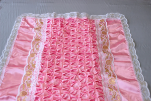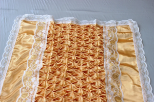 Ритуальное покрывало №81 изготовлено из материала Атлас, центр Буфы с Жемчугом. Шьется изделие из разных материалов, в качестве окаймления используют кружево либо ленту-рюш, что придает атрибуту утонченного и красивого вида.